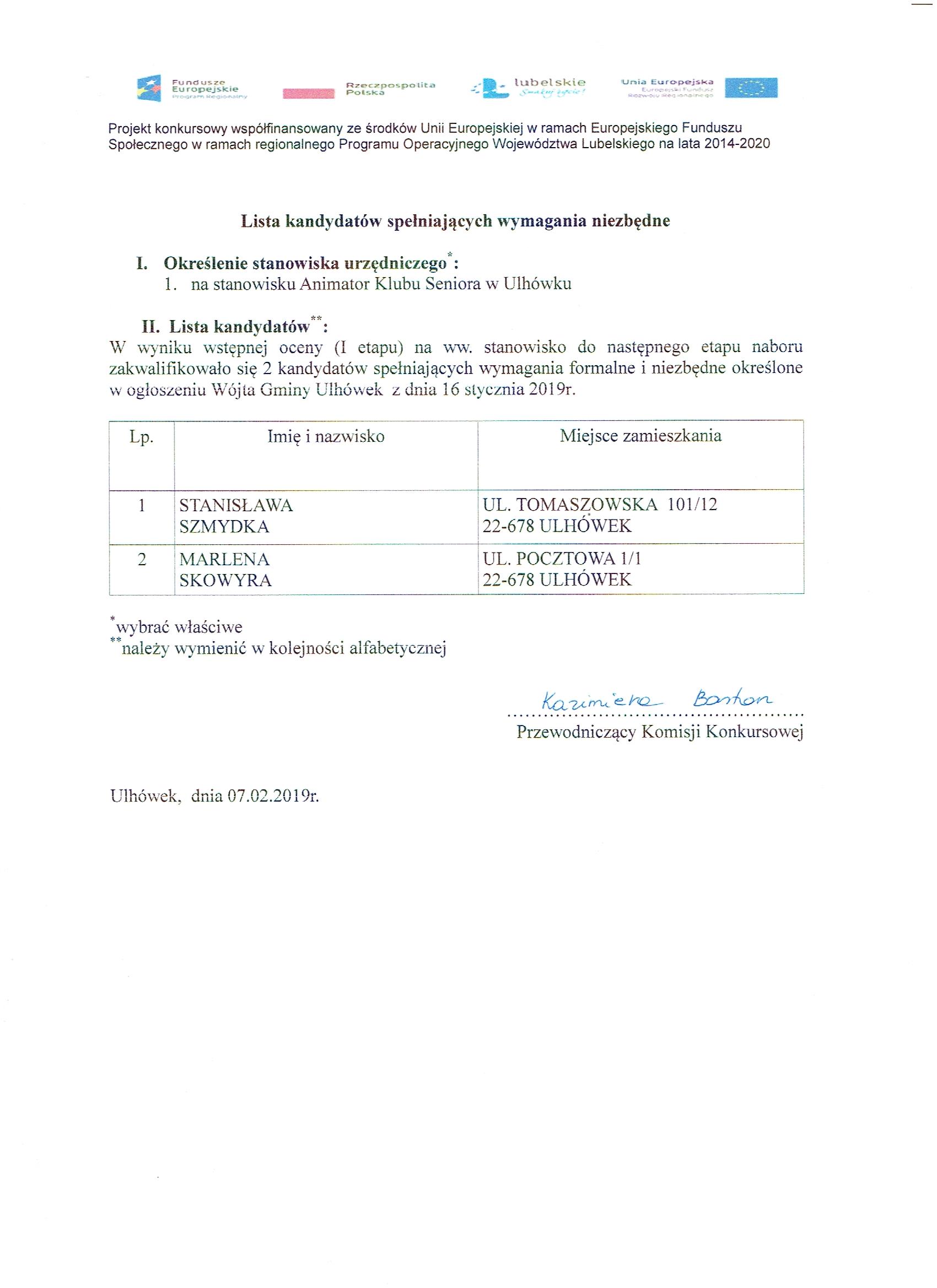 1.Lista kandydatów spełniających wymogi formalne zostanie umieszczona na stronie internetowej Biuletynu Informacji Publicznej Urzędu Gminy Ulhówek oraz na tablicy ogłoszeń dnia 7 lutego 2018r. do godz. 15°°