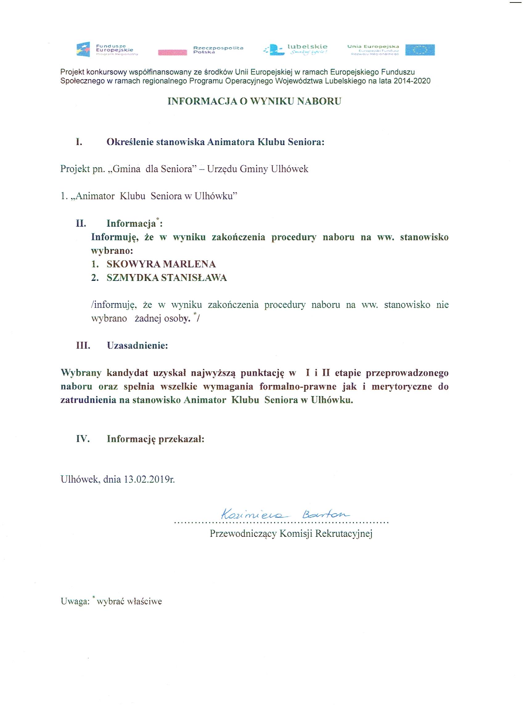 3.Informacja o wynikach naboru zostanie umieszczona na tablicy ogłoszeń Urzędu Gminy Ulhówek i Biuletynie Informacji Publicznej najpóźniej w terminie do dnia 8 lutego 2019r. do godz.15°°